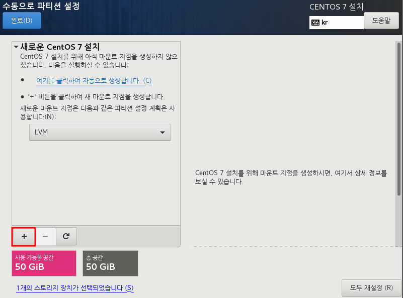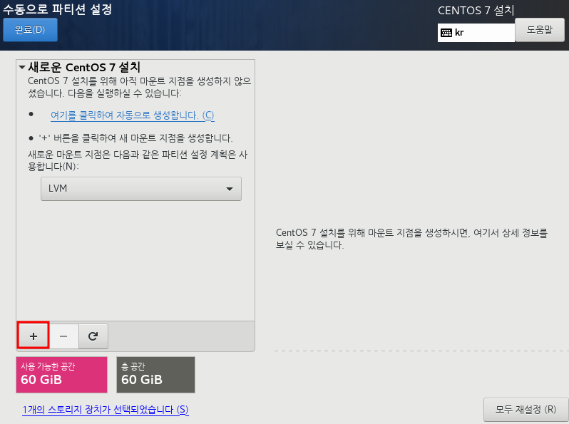 - 완료 후 수동으로 파티션을 설정하는 화면 출력, +버튼을 통해 파티션을 추가.