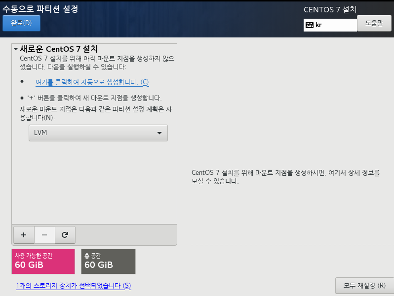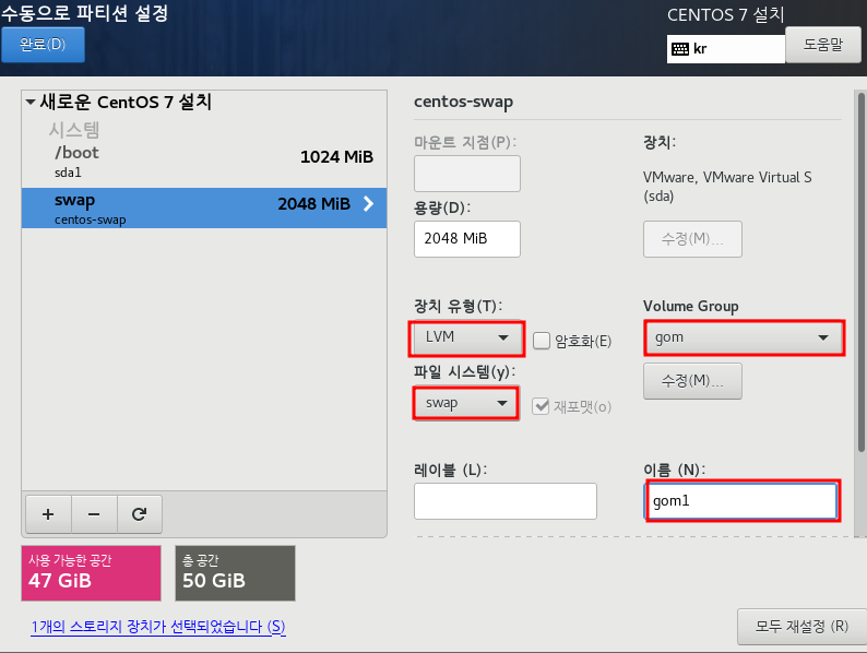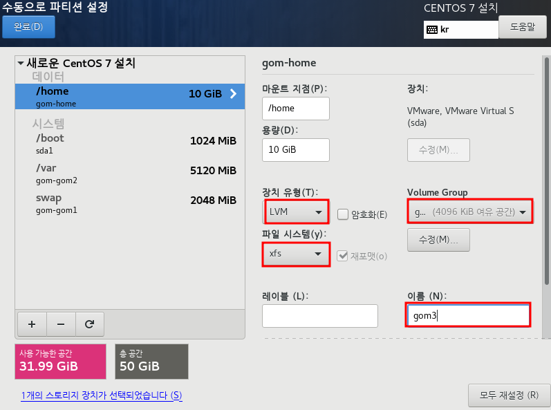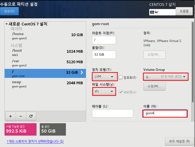 - / : 장치의 유형은 LVM, 그룹은 gom, 파일시스템은 xfs, gom4라는 이름을 가진 파티션으로 지정.
