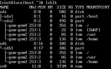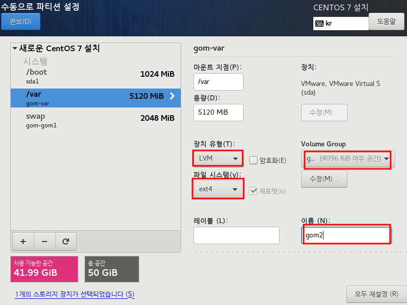 - /var : 장치의 유형은 LVM, 그룹은 gom, 파일시스템은 ext4, gom2라는 이름을 가진 파티션으로 지정.