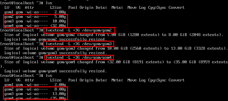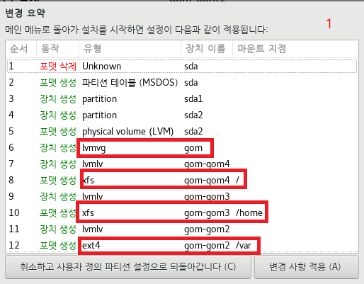 - 변경사항을 확인하면 /boot, lvm gom과 하위 lv 파티션들이 생성이 완료.
