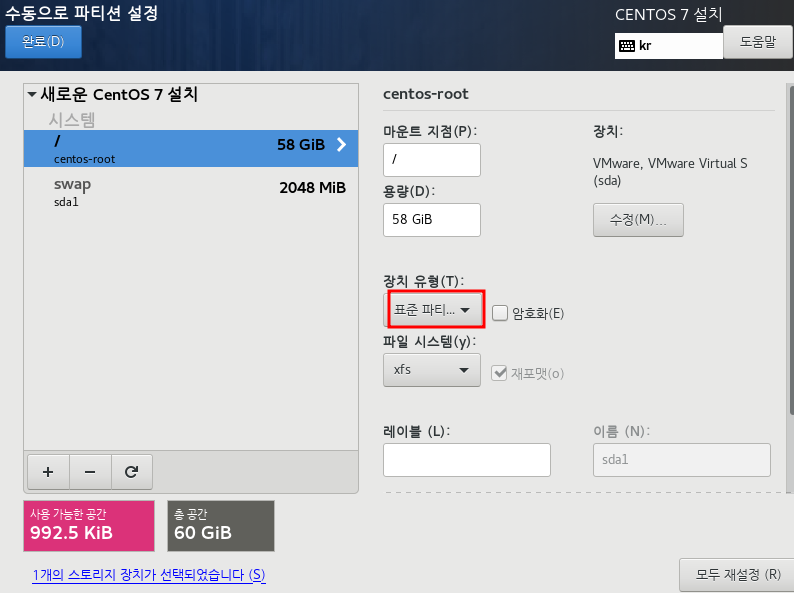 - 리눅스 설치과정 중 설치 대상 옵션을 선택하여 파티션 구성.