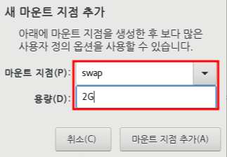 - 먼저 용량이 정해진 swap을 지정해주면 /는 용량지정없이 나머지 용량을 할당.