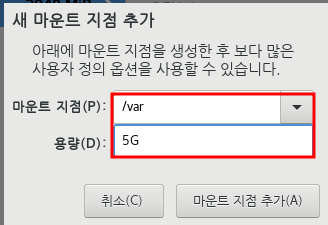 - /boot와 swap, /var 마지막으로 /home으로 총 4개의 파티션으로 구성하며, 각각 1G, 2G, 5G, 10G 용량을 지정.
