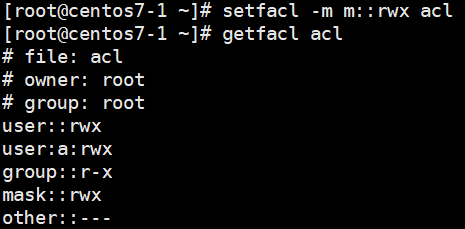 * mask값 변경 => -m m : : (r,w,x)(권한) // 마스크 값으로 전체의 권한을 일시적으로 제어.