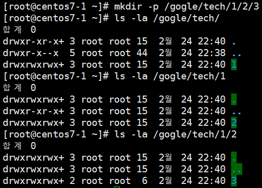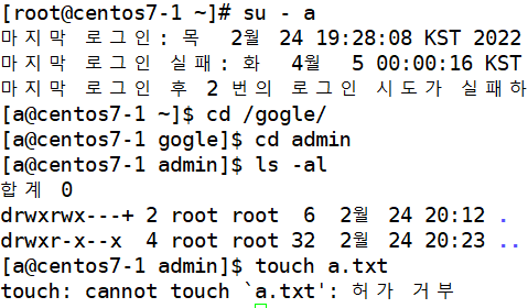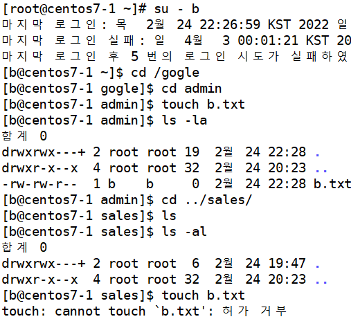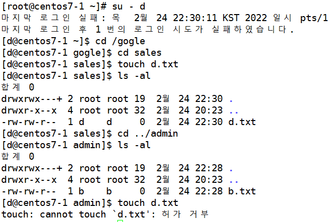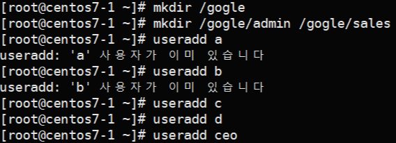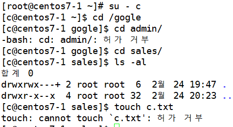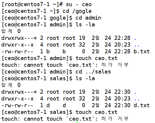 - 최상위 디렉토리 gogle을 생성하고 하위 디렉토리 admin과 sales을 생성 후 권한 변경을 확인.