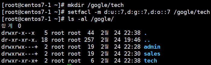 - setfacl -m 명령어를 통해 상단의 기입된 권한대로 admin과 sales디렉토리 사용자의 권한 설정.