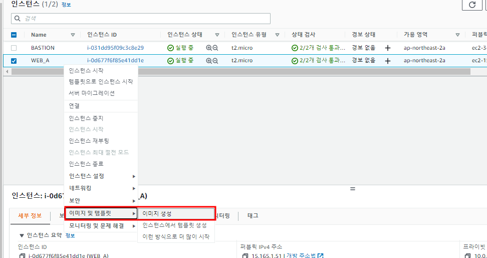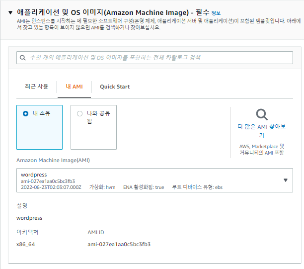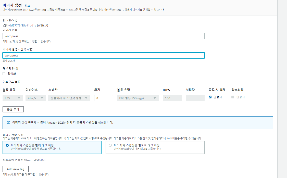 - 생성해놓은 wordpress가 설치된 인스턴스로 이미지(ami) 생성
