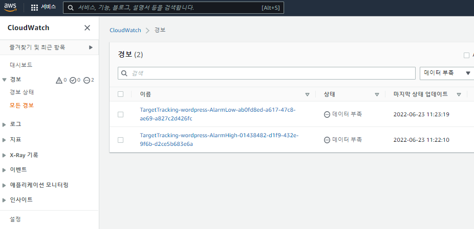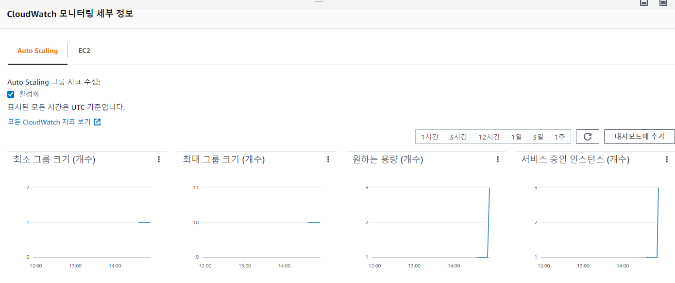 - cloudwatch로 확인하여 보면 정상적으로 부하가 적용됨을 볼 수 있다.