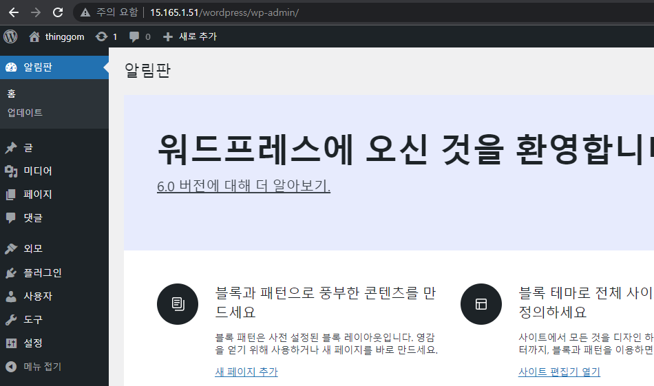 - 진행 한 후 접속하여 보면 wordpress가 동일하게 생성되어 있음을 확인