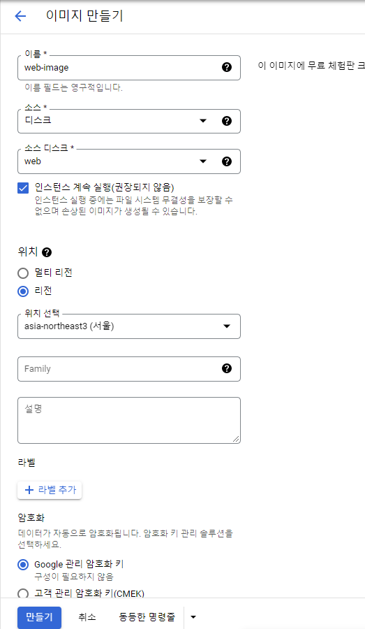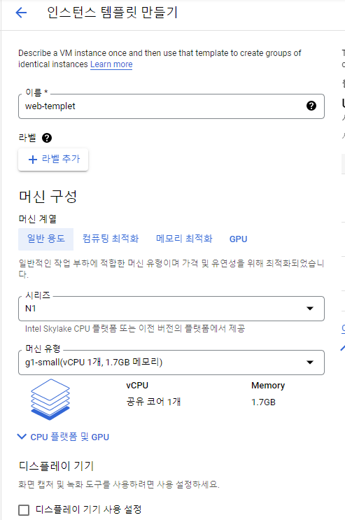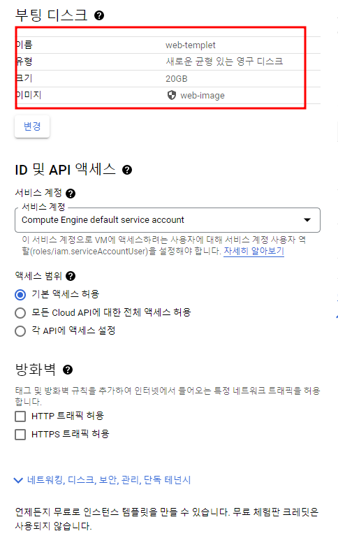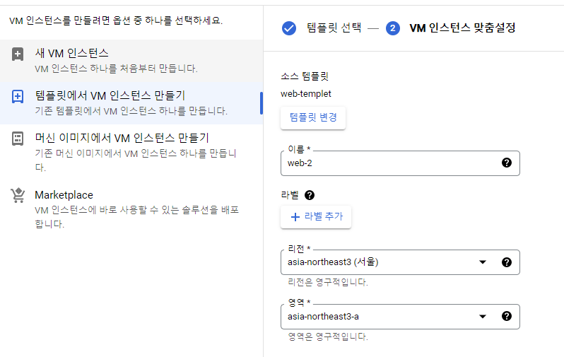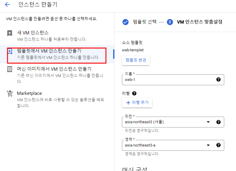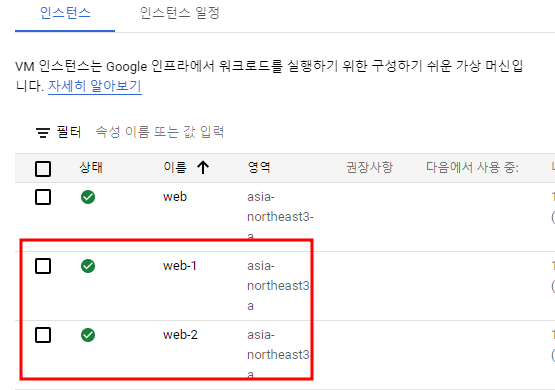- 생성한 인스턴스 템플릿을 통해 web-1, web-2 인스턴스 생성