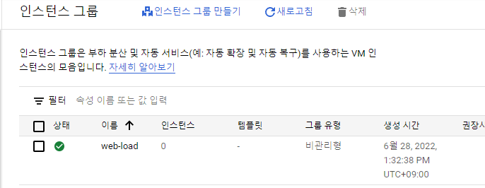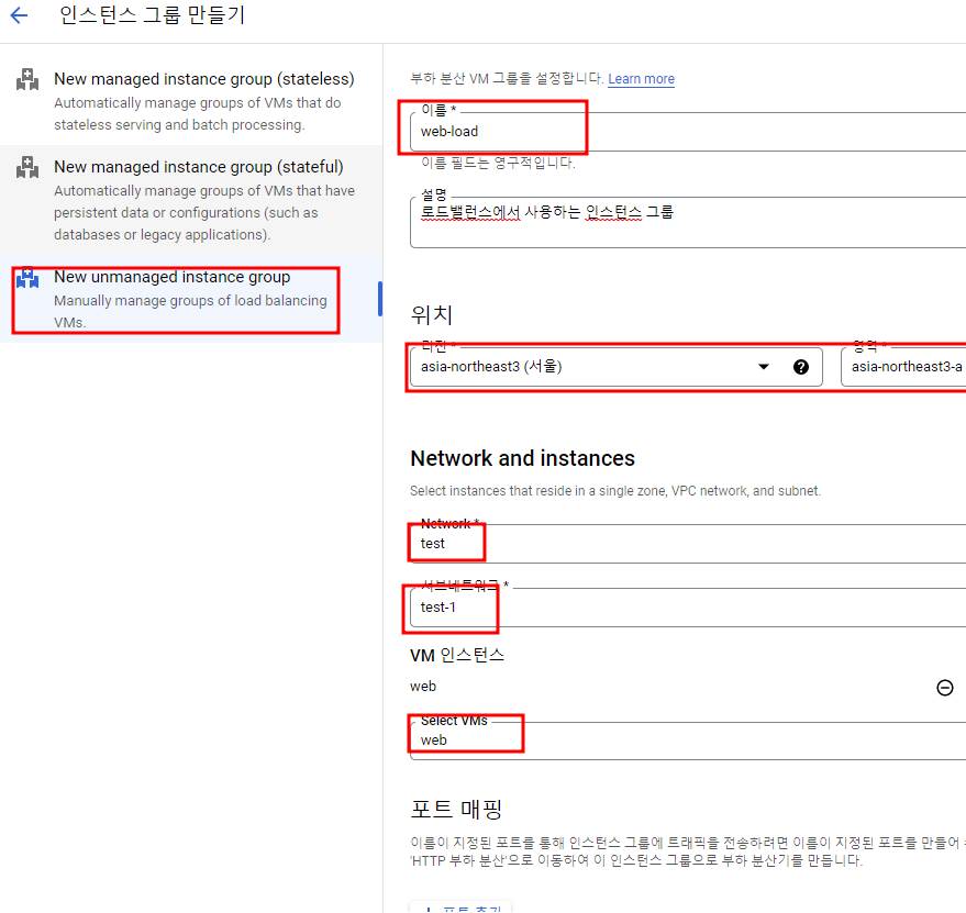 - 인스턴스 그룹만들기 ( NEW unmanaged instance group ( 부하분산 그룹) )