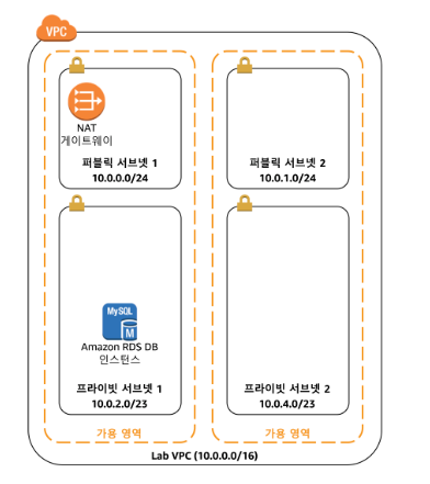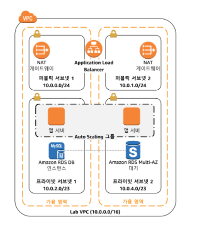 - 미리 2개 가용영역을 가진 VPC, 2개의 퍼블릭, 프라이빗 서브넷, 1개의 NAT게이트웨이, RDB 인스턴스 제공