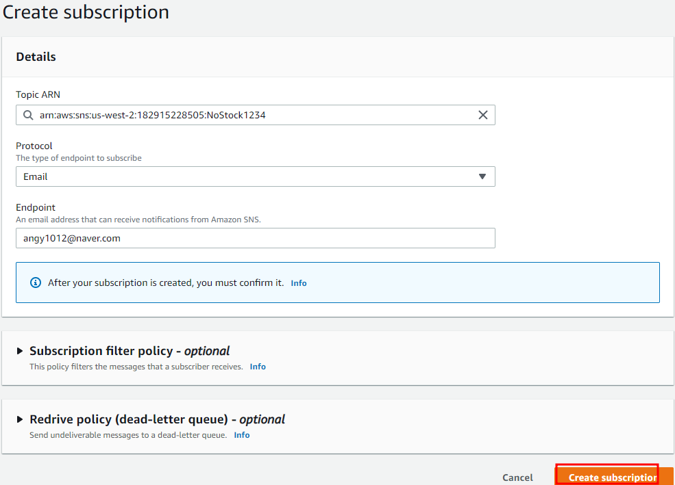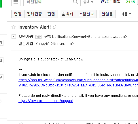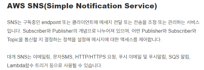 - amazon SNS : 클라우드에서 손쉽게 알림 기능을 설정, 작동 및 전송할 수 있는 웹 서비스