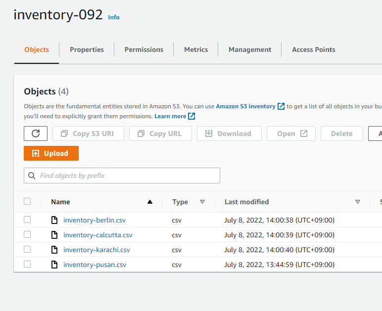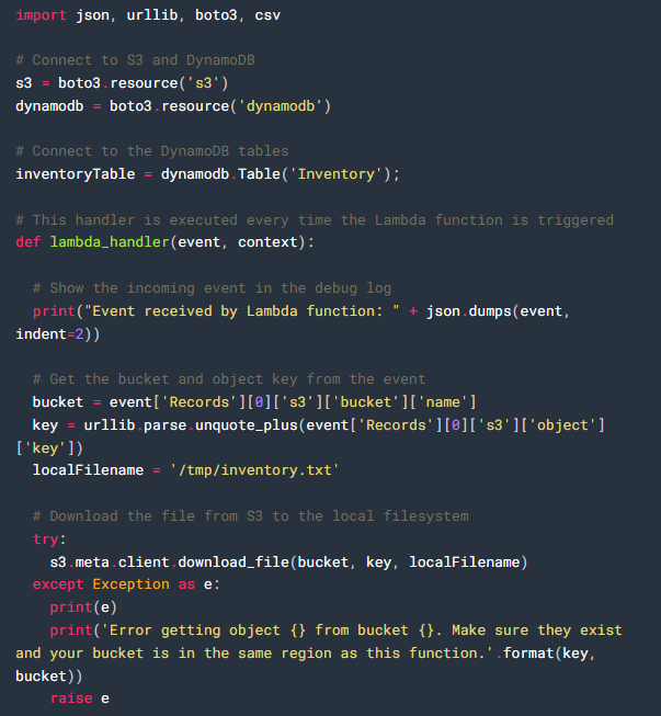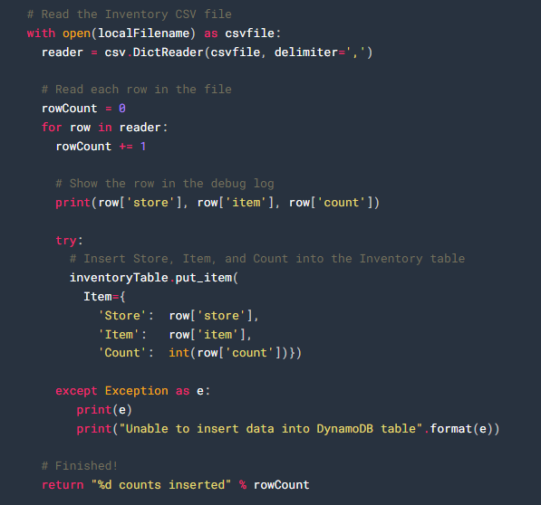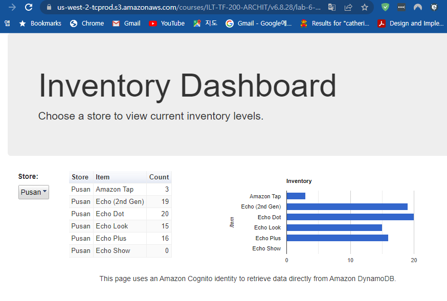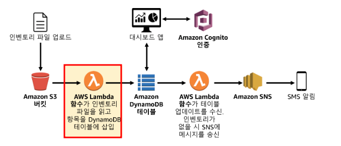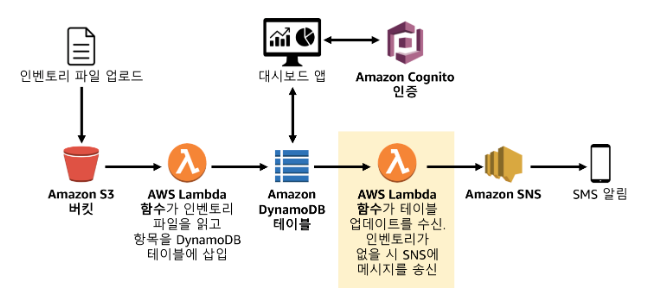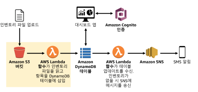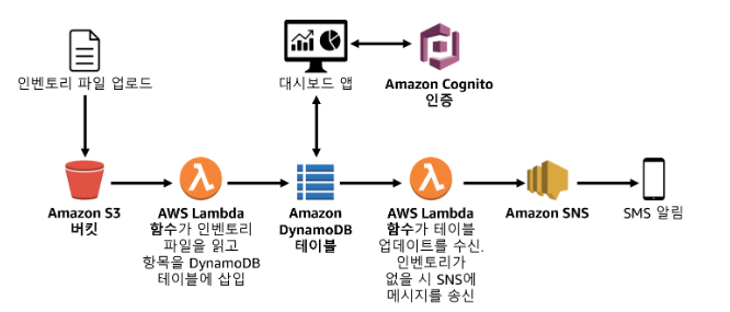 csv 재고 내역파일이 s3 업로드 -> lambda 함수가 dynamodb 테이블에 콘텐츠 로드 -> 재고내역을 서버리스 대시