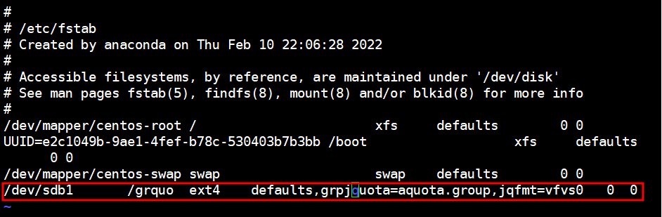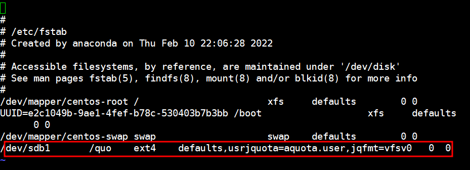 ex) 디스크 폴더 파일시스템형식 defaults,usrjquota=aquota.user,jqfmt=vfsv0 0 0