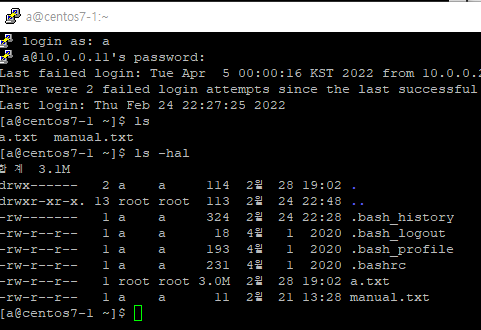 - putty를 통해 a 사용자로 로그인 후 더미 파일 확인