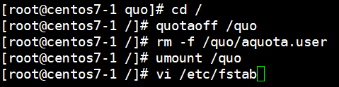 - quota 제거는 역순으로 진행하며, 해당 디렉토리에서 나온 후 quotaoff -> quota db 제거 -> 마운트 해제 -> /etc/fstab에 적힌 마운트 해제