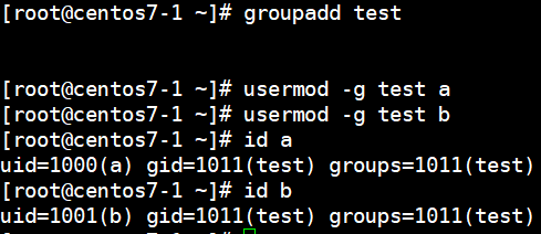 - 그룹 quota를 생성하기 위해 그룹 test를 생성하고, test 그룹을 가지는 a와 b 사용자 생성