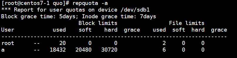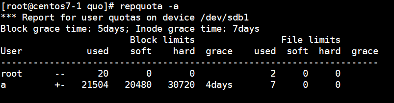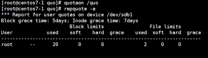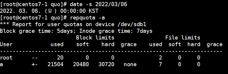 - quotaon 명령어를 이용하여 quota를 실행 후 repquota -a 명령어를 통해 확인.