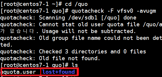 - quota 설정을 위해 해당 디렉토리로 이동 후 quotacheck 명령어를 이용하여 user quota database를 생성
