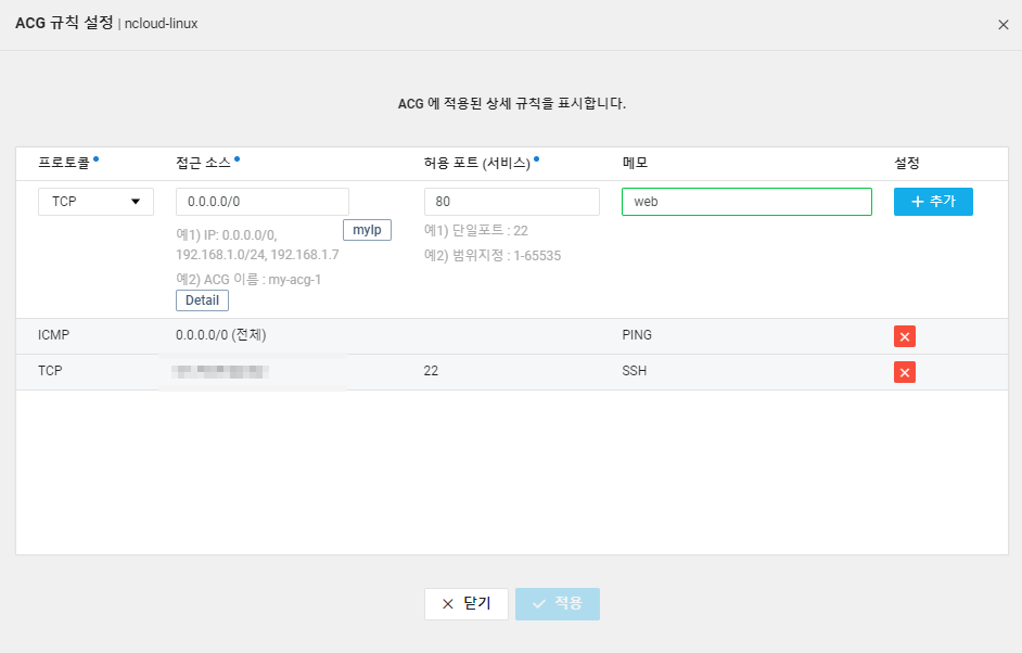 - 웹서버를 사용하기 위해서는 네이버 클라우드에서 포트 80을 열어주어야한다.