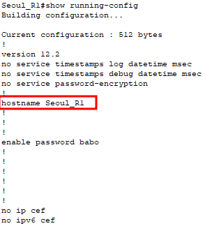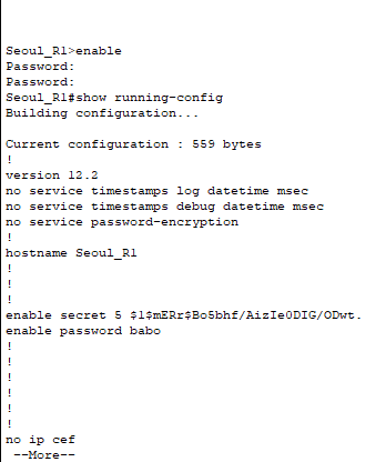 5) service password-encryption : 모든 평문 패스워드를 암호화 ( 전역설정모드에서 적용 )