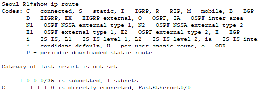* show ip route : 라우팅 테이블 확인하는 명령어 ( 관리자 모드에서 실행 )