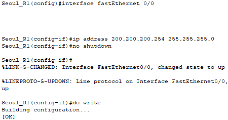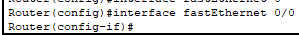 - interface faseEthernet 0/0 : Router(config-if)#: 하위구성모드, 인터페이스 설정모드