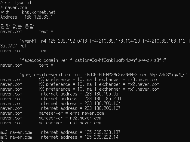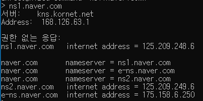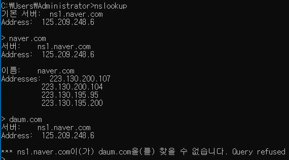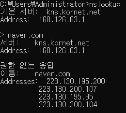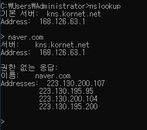 - 랜서버 질의 : nslookup -> 찾고자 하는 도메인 주소