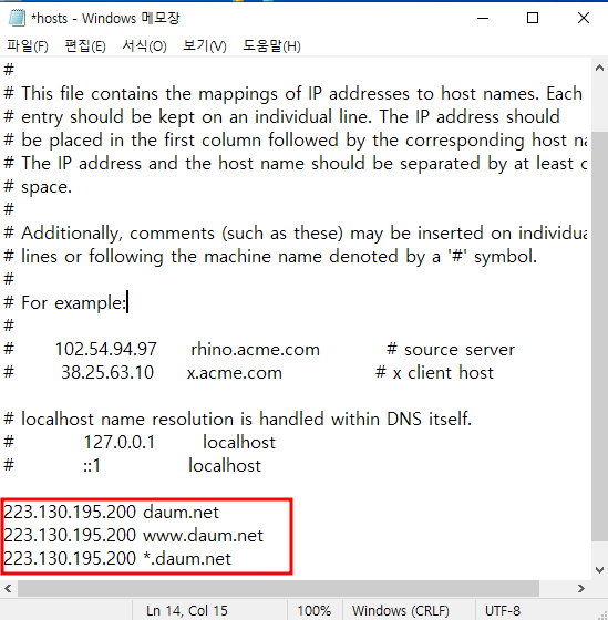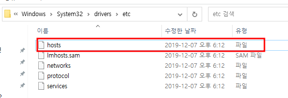 - (캐시 적용 확인 과정) 아래 경로에 있는 hosts 파일에 주소 입력 ( 캐시 파일 )