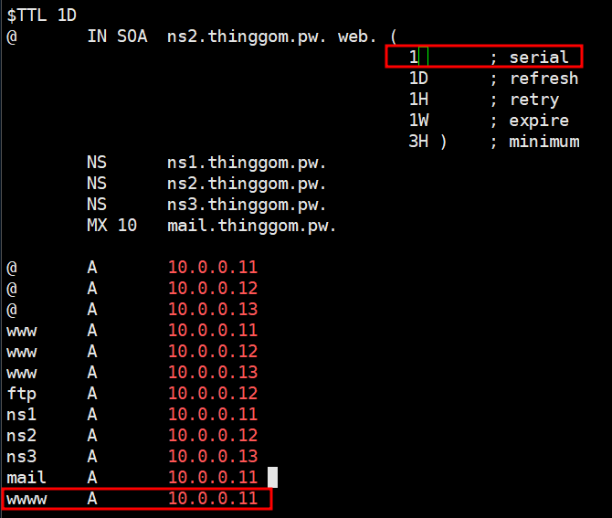 다음과 같이 wwww를 추가하였다. 보조dns에 업데이트해주기 위해서는 serial 부분에 0보다 큰 숫자 입력.서비스를 재시작