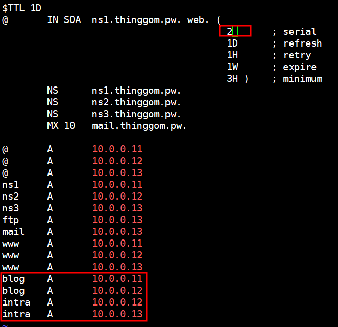 - 첫번째 리눅스에서 thinggom.pw 영역 파일에 블로그와 인트라 기입 영역
