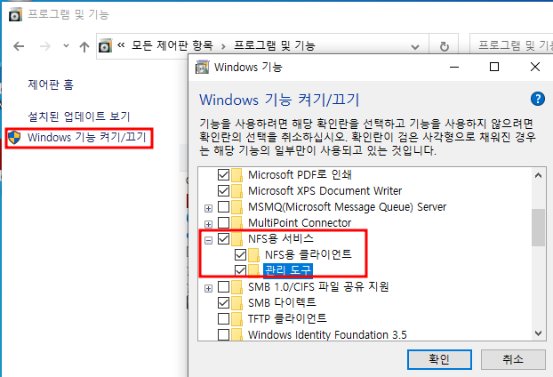- 윈도우에서 nfs 연결/ 제어판을 통해 설치 후 사용
