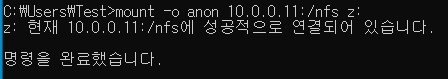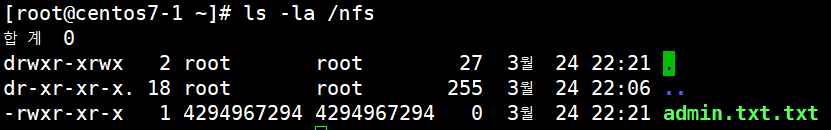 - 해당 디렉토리에 파일을 생성하기 위해서는 nfs 디렉토리에 쓰기 권한을 부여하여야한다.