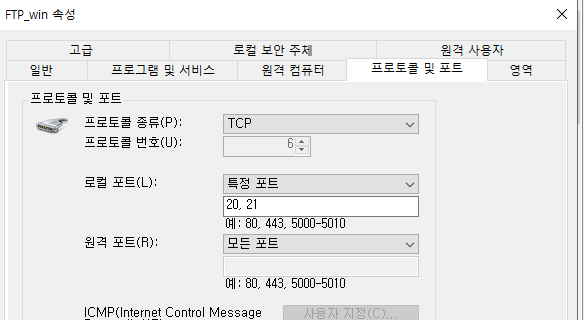 - 방화벽 고급설정을 통해 20,21번 포트개방