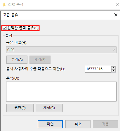 - 속성 -> 고급 공유를 통해 선택한 폴더 공유