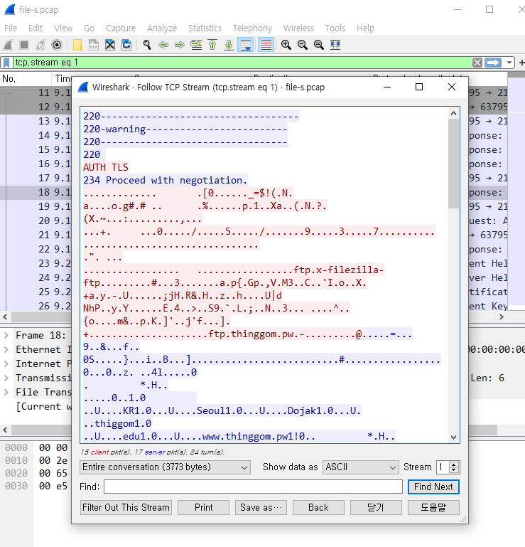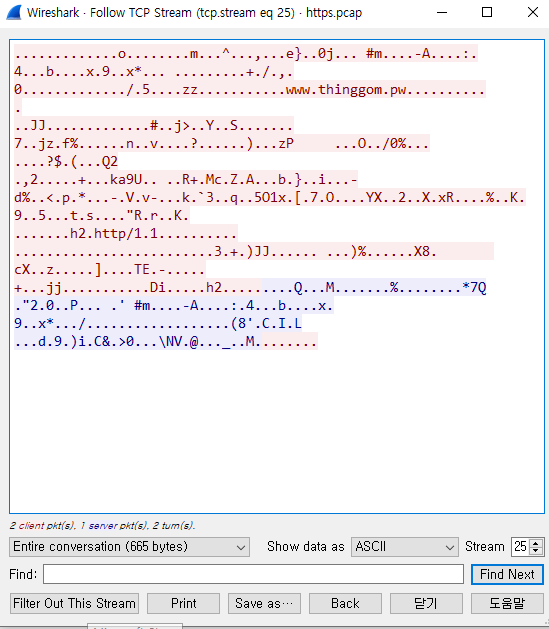 - tcp stream을 확인하여 보면 코드가 암호화 되있음을 확인