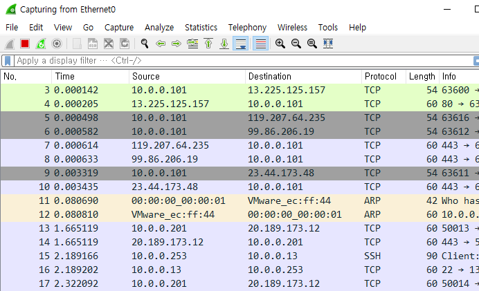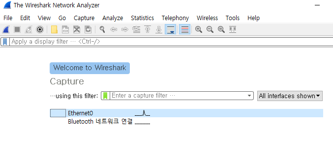 - wireshar 실행하면 카드가 보인다. 이더넷 카드 선택