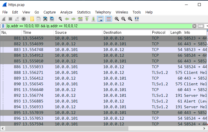ip.addr 로 클라이언트 ip와 접속된 사이트의 ip를 검색하여 패킷 탐색