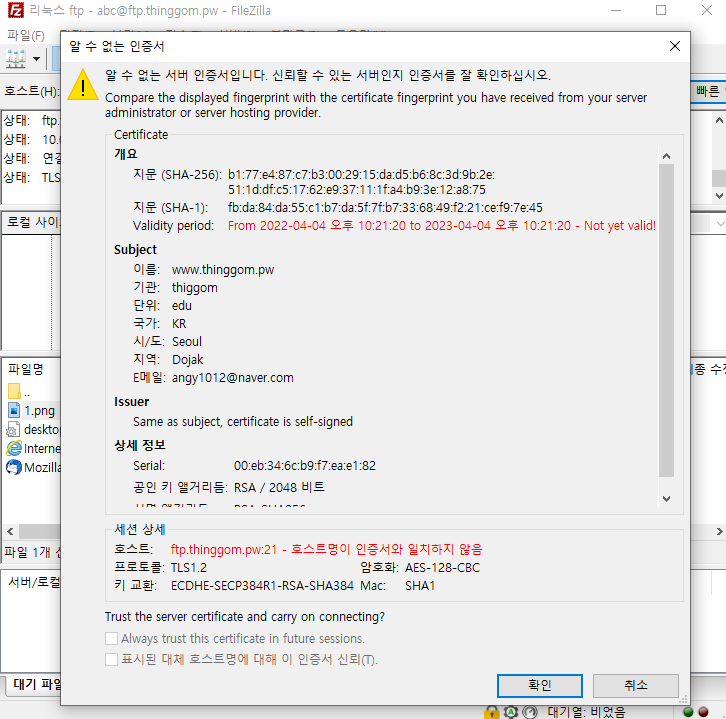 - 파일질라를 통해 연결하면 종단간 신뢰성 확보가 되지 않는다. 확인하면 연결