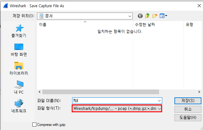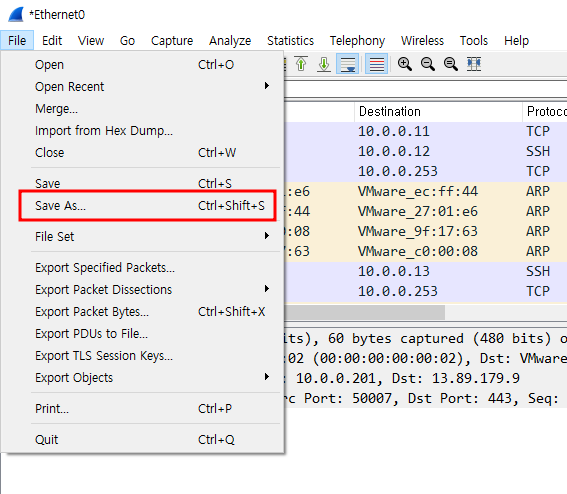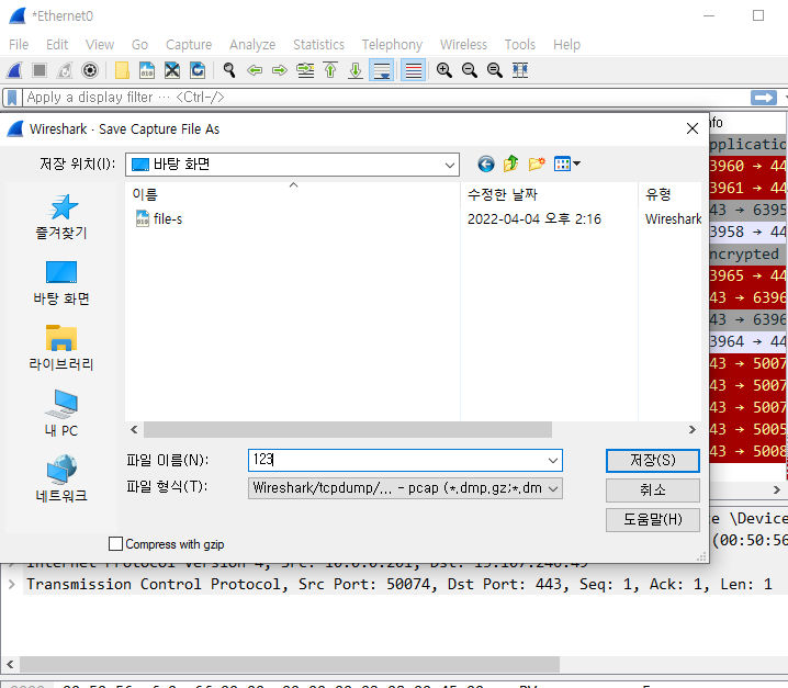 - 와이어샤크 검색을 멈춘 후 다른이름으로 패킷 캡처 저장