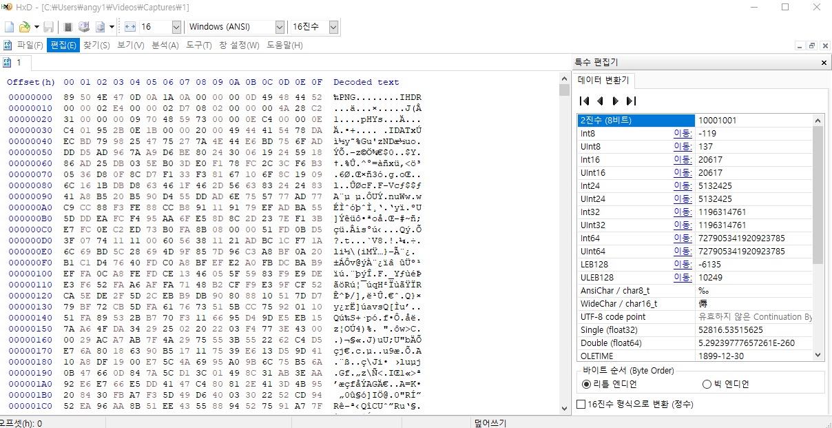 - 한글 핵스 에딧을 설치하고 실행. 위에서 다운받은 원시코드를 연다. 후 다른 이름으로 png 파일로 저장