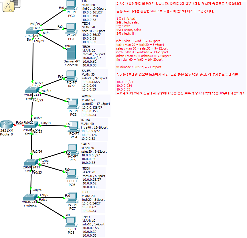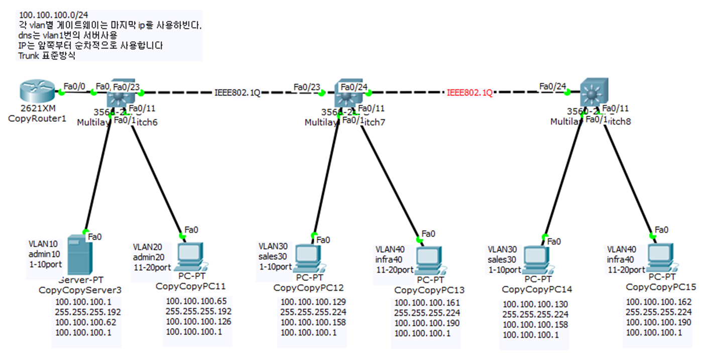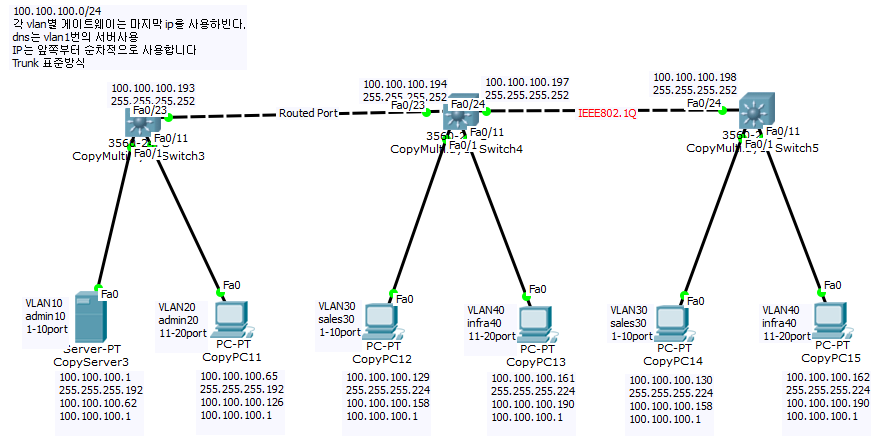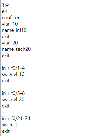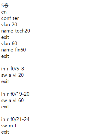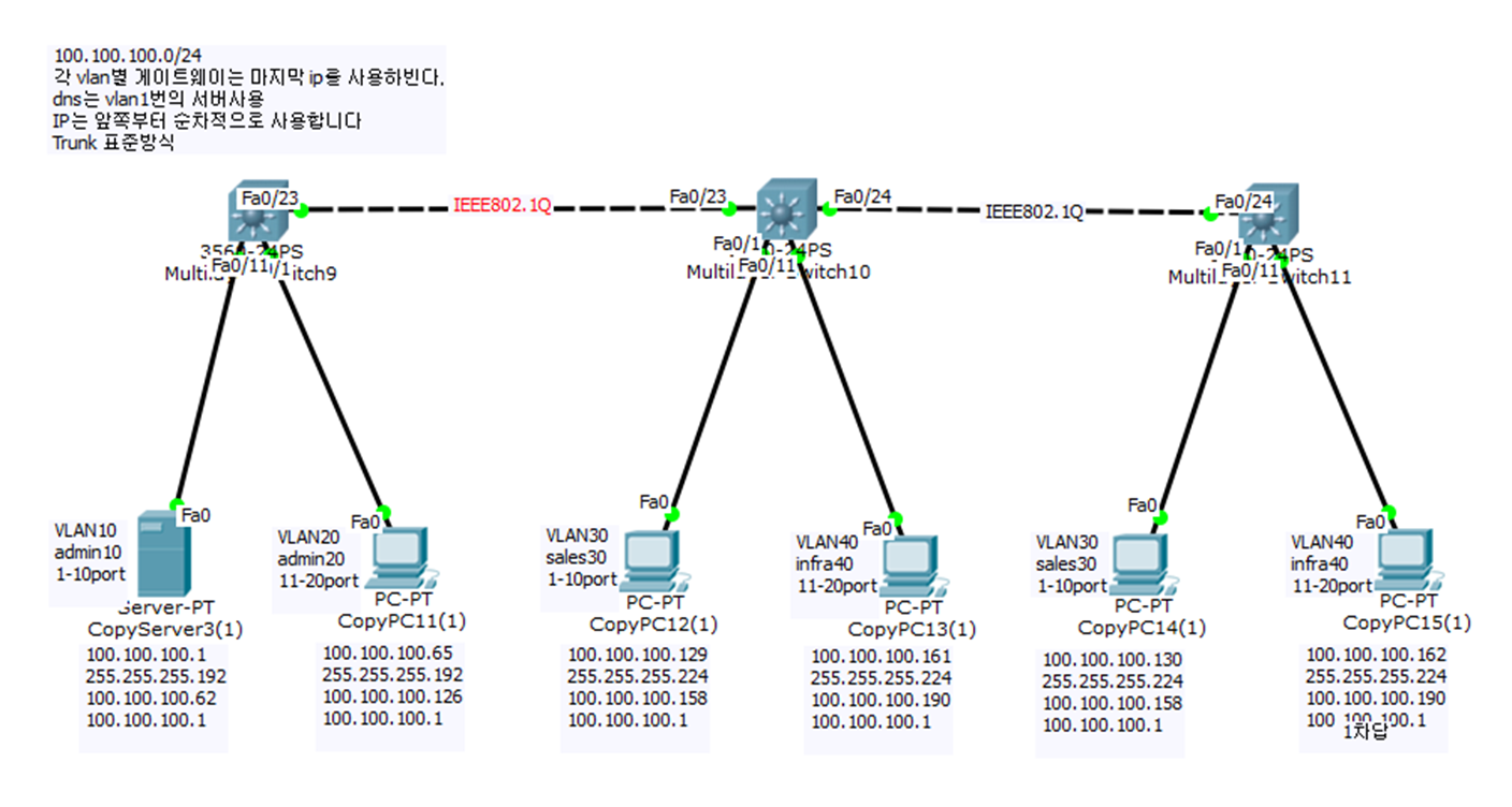 - 다른 vlan도 동일한 방식으로 연결하며, 모든 스위치에 vlan 추가