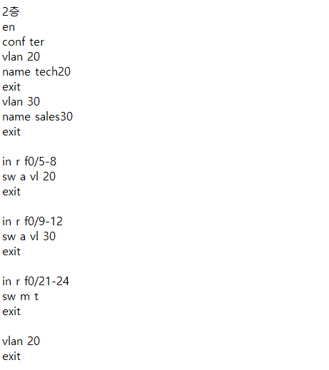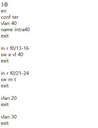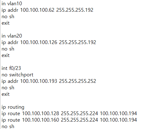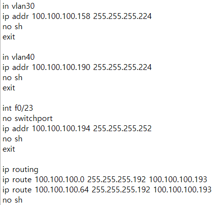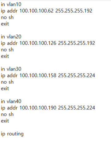 - vlan에 각각에 맞는 게이트웨이를 작성 후 스위치끼리 연결된 포트를 no switchport하여 IP를 입력.