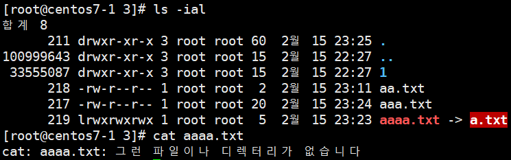 > 소프트 링크를 이용하여 aaaa.txt를 생성. 아이노드가 다른 것을 볼 수 있다.