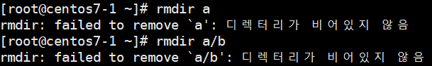 - #rmdir -p 이름1/이름2/이름3 : -p 옵션을 통해 하위 디렉토리까지 삭제할 수 있다. 단 디렉토리 경로에 파일이 존 재하면 해당 디렉토리까지만 삭제