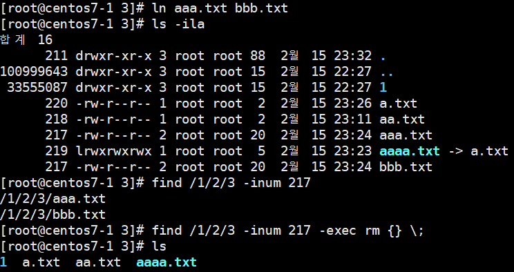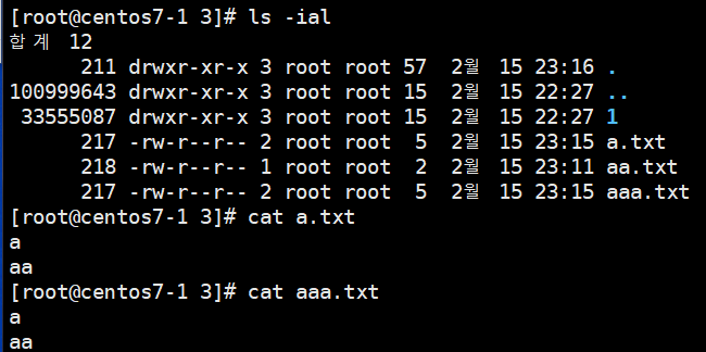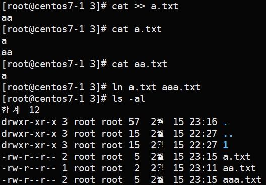 > cat을 통해 a.txt 파일을 생성하고 이를 하드링크를 이용하여 aaa.txt 파일을 만듬.