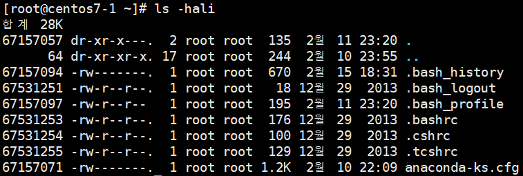 - hali의 옵션을 한번에 사용하여 centOS7-1의 모든 파일과 디렉토리의 inode number와 속성정보가 보인다.