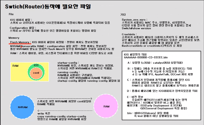 - NVRAM : startup-config 파일 저장 : 비휘발성