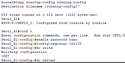 - startup-config 파일을 가져와서 running config로 사용. ( 비밀번호 없이 진입 가능 )